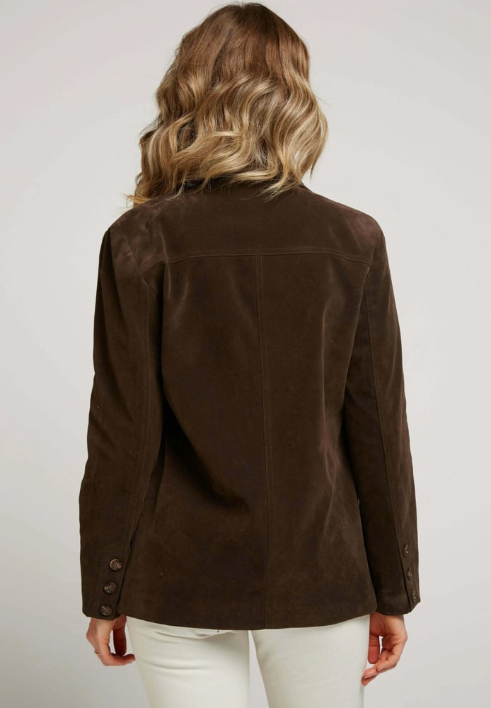 Chaqueta blazer de ante rígido estilo cuero envejecido, disponible en camel y chocolate.