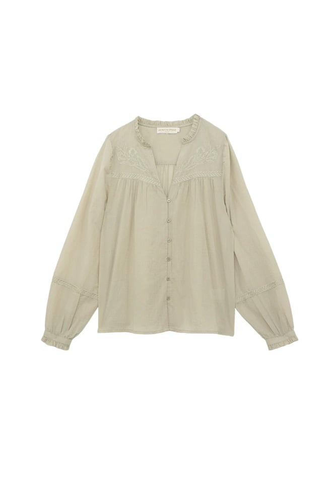 Blusa 100% algodón de corte recto holgado con escote en V con volantes, mangas largas y puños abotonados: un modelo cómodo, femenino y fácil de llevar, ideal para un estilo veraniego o de temporada.
