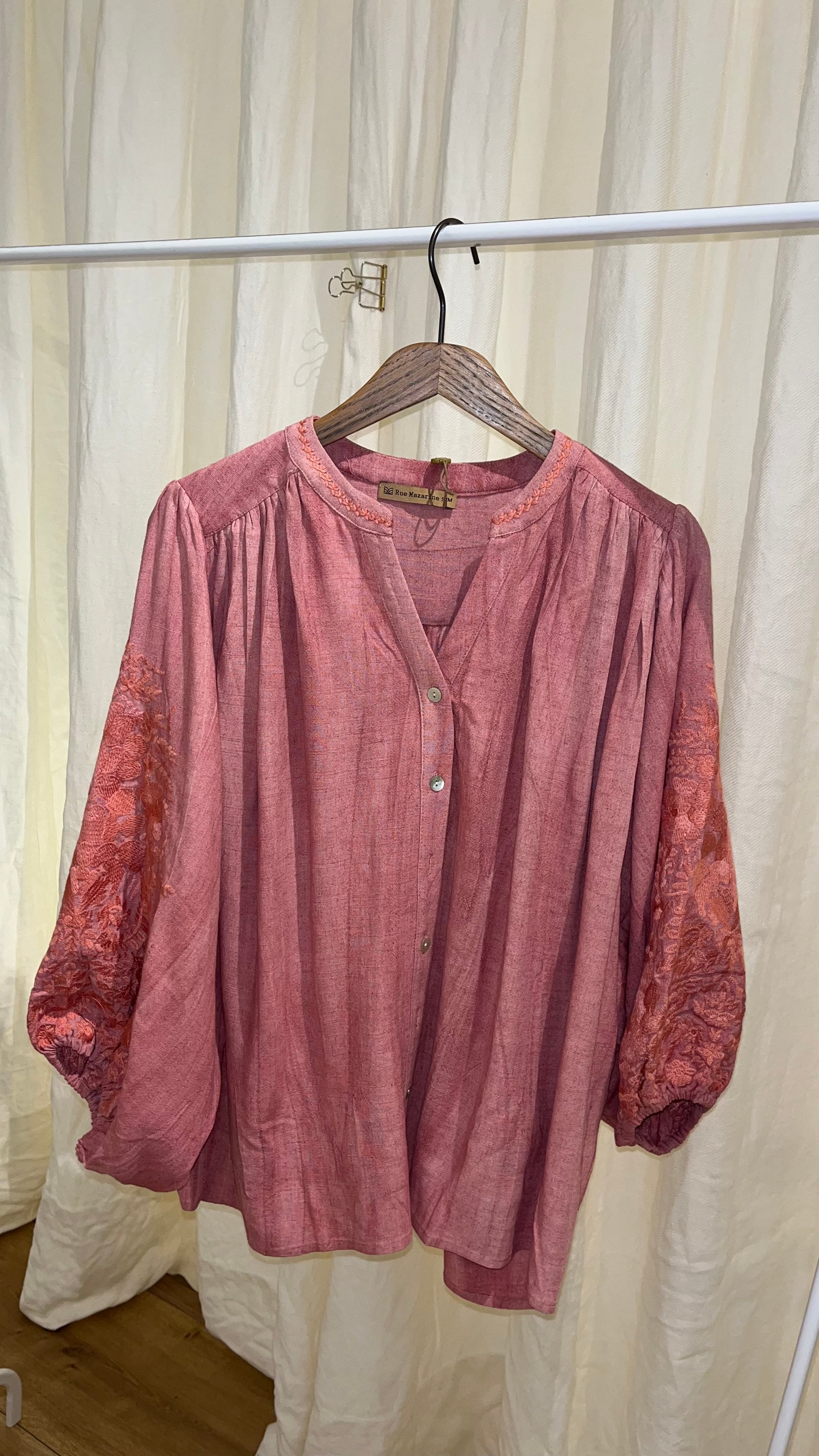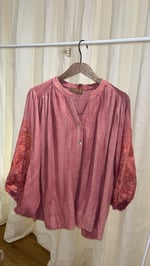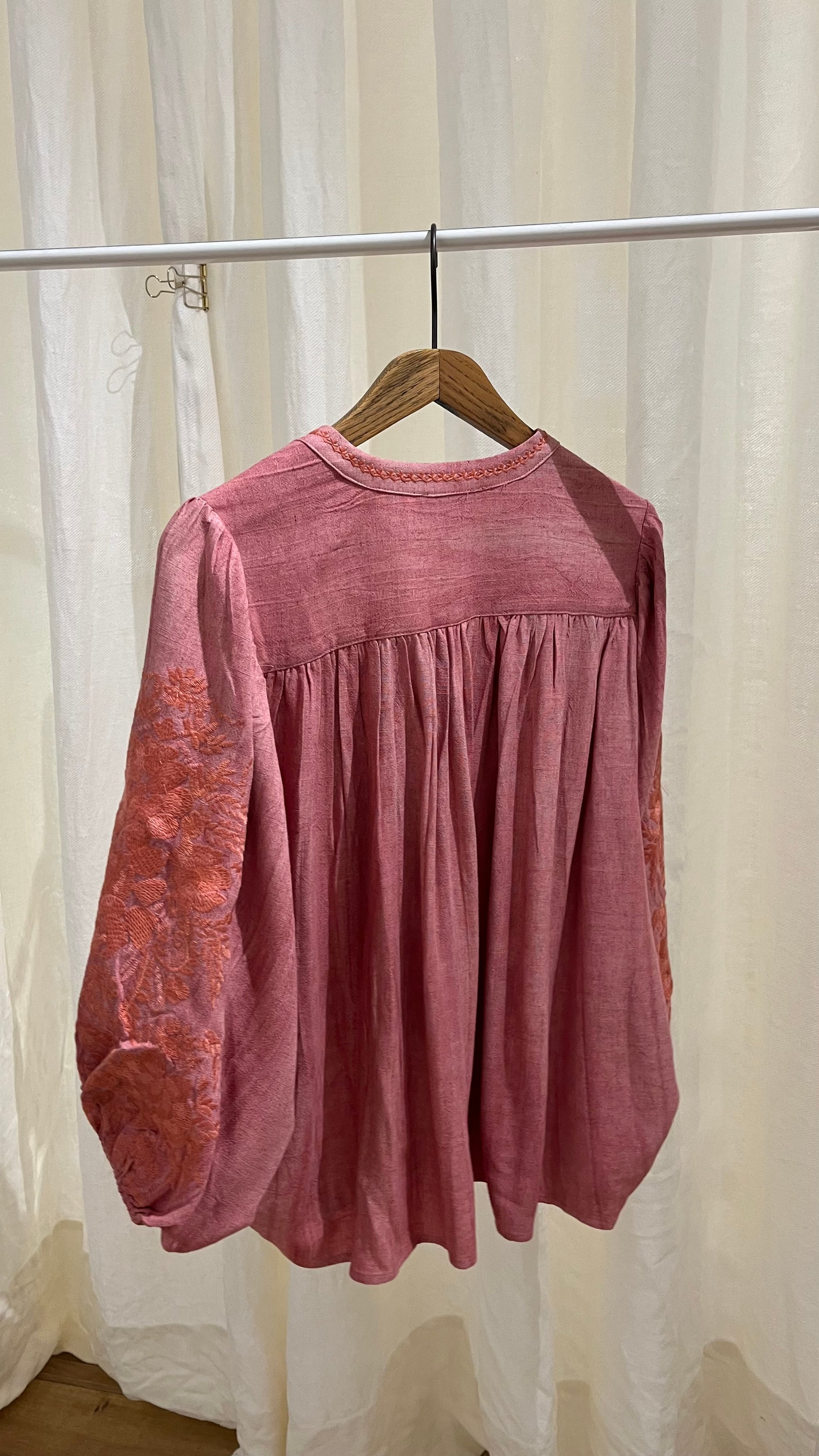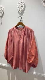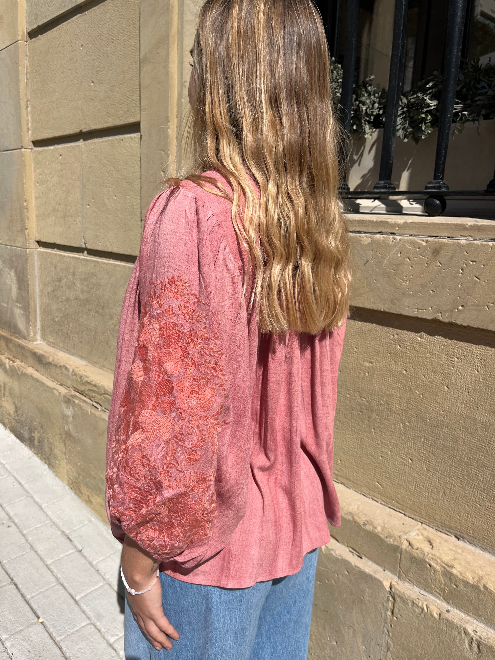Blusa de estilo romántico y corte fluido en tono coral.