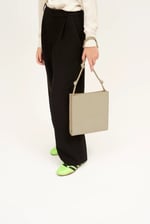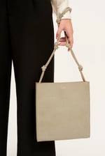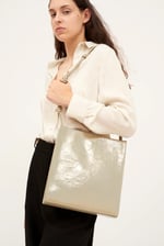 Este bolso combina el brillo del charol, tendencia total, con el detalle de los nudos a lo largo de sus asas laterales, que aportan un guiño orgánico, evocando las ramas de las vides que se enroscan mientras crecen.