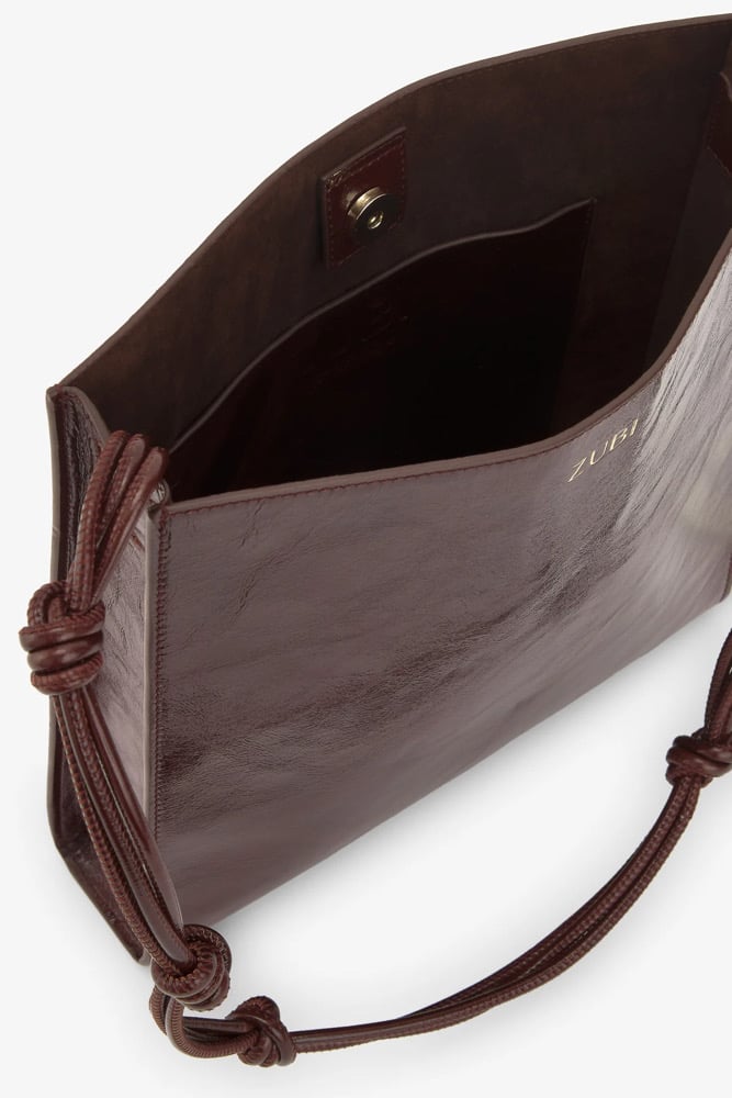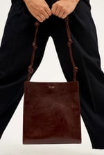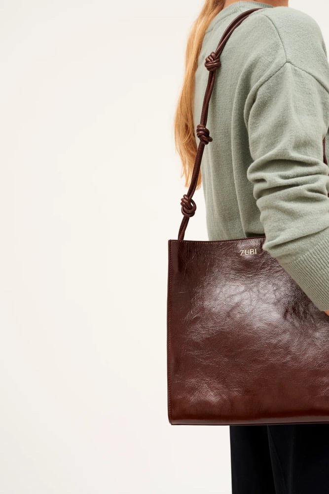 Este bolso combina el brillo del charol, tendencia total, con el detalle de los nudos a lo largo de sus asas laterales, que aportan un guiño orgánico, evocando las ramas de las vides que se enroscan mientras crecen.