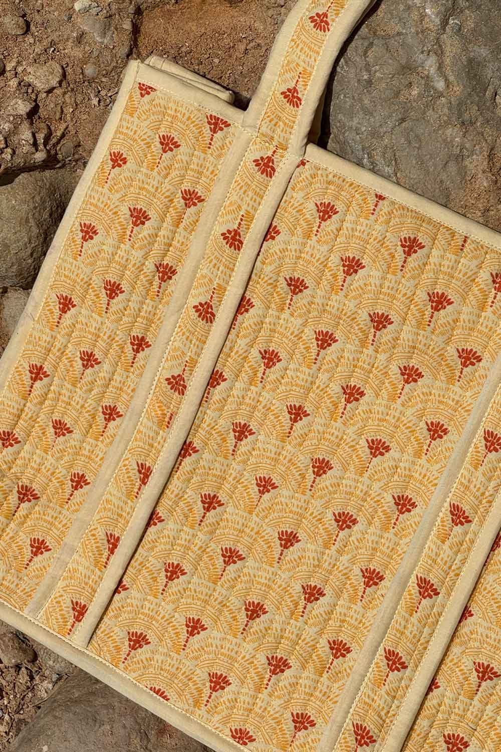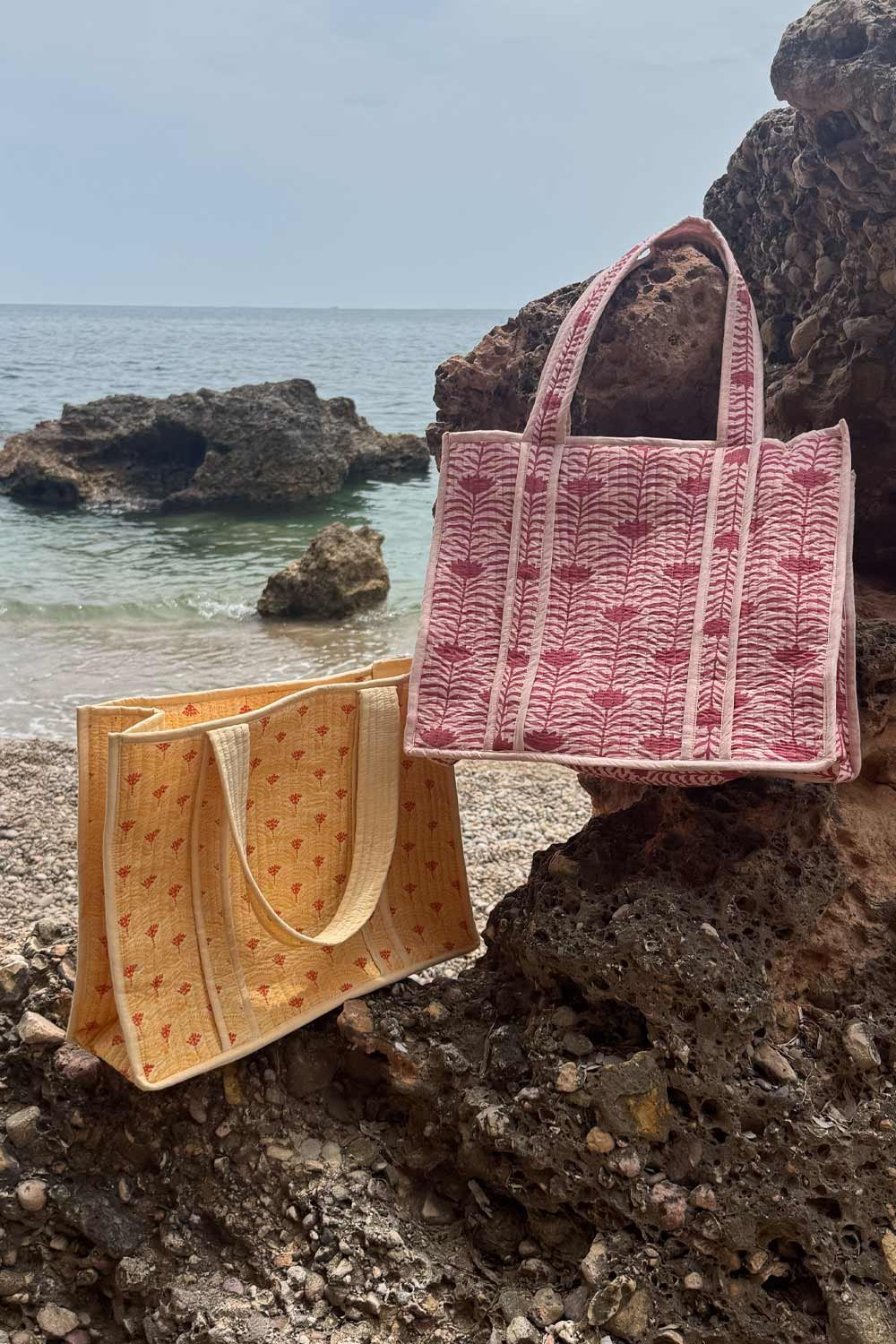Bolso acolchado confeccionado en tela de algodón estampada. Diseño ligero y versátil, con tirantes largos a juego y cierre con cremallera. El complemento perfecto para la playa.