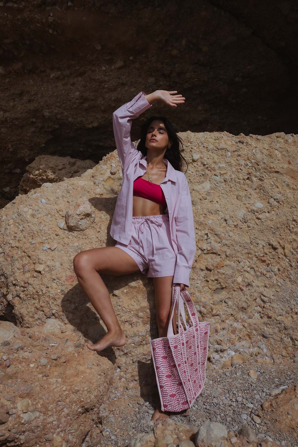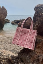Bolso acolchado confeccionado en tela de algodón estampada. Diseño ligero y versátil, con tirantes largos a juego y cierre con cremallera. El complemento perfecto para la playa.