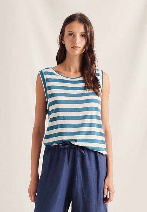 Camiseta de rayas horizontales, sin mangas y cuello redondo.
