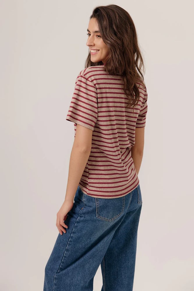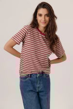 Camiseta de manga corta a rayas, cuello redondo en contraste.