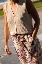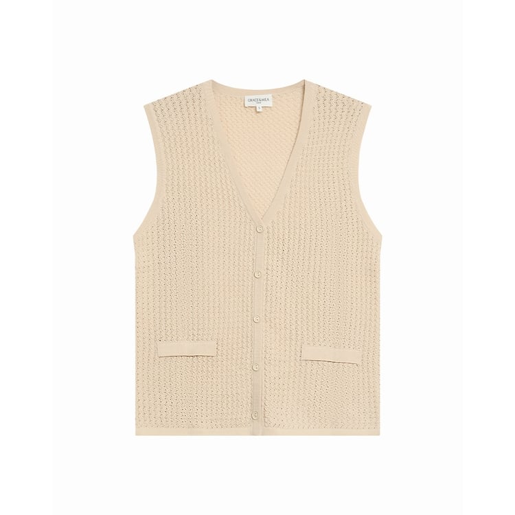 Cierre de botones y bolsillos con solapa en la parte delantera, que añade un toque de elegancia a esta prenda texturizada.