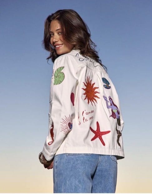 Dale un toque único a tu estilo con esta chaqueta de diseño creativo. Confeccionada en un tejido ligero y cómodo, presenta un fondo en tono claro que sirve como lienzo para un conjunto de ilustraciones vibrantes inspiradas en la naturaleza y el arte, como soles, estrellas de mar y formas orgánicas en colores llamativos.