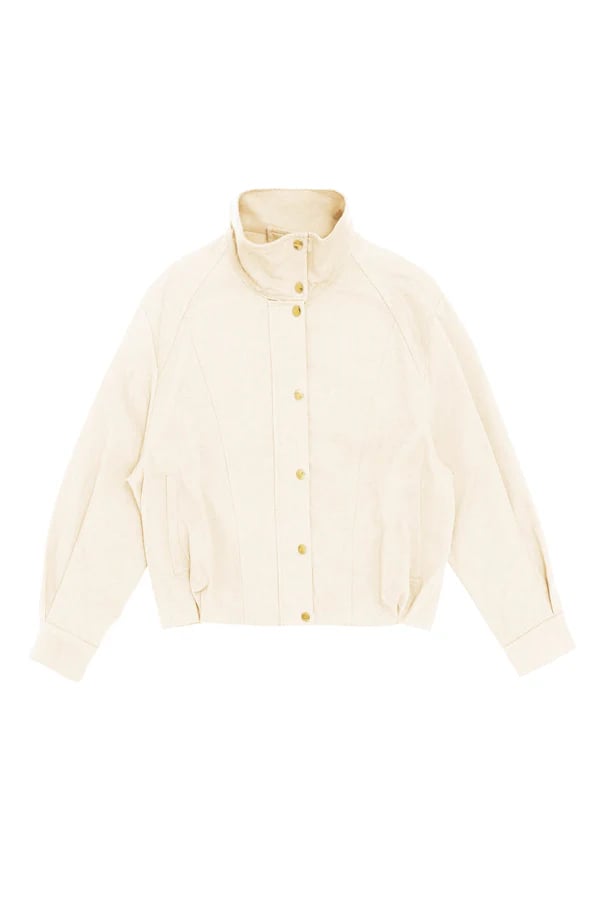 Chaqueta corta beige de corte oversize. Cuello alto y acampanado