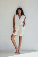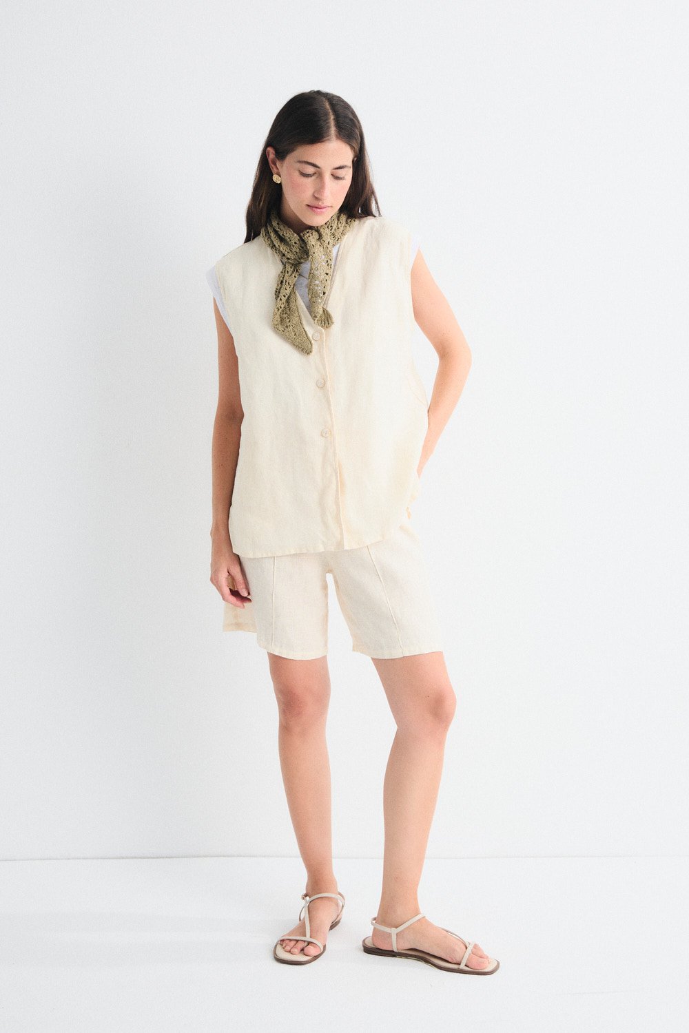 Chaleco largo confeccionado en lino, con cierre frontal de botones