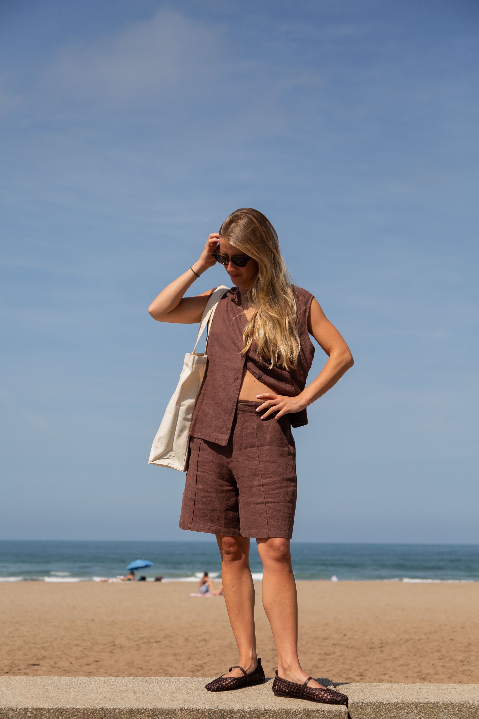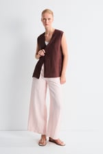 Chaleco largo confeccionado en lino, con cierre frontal de botones