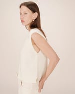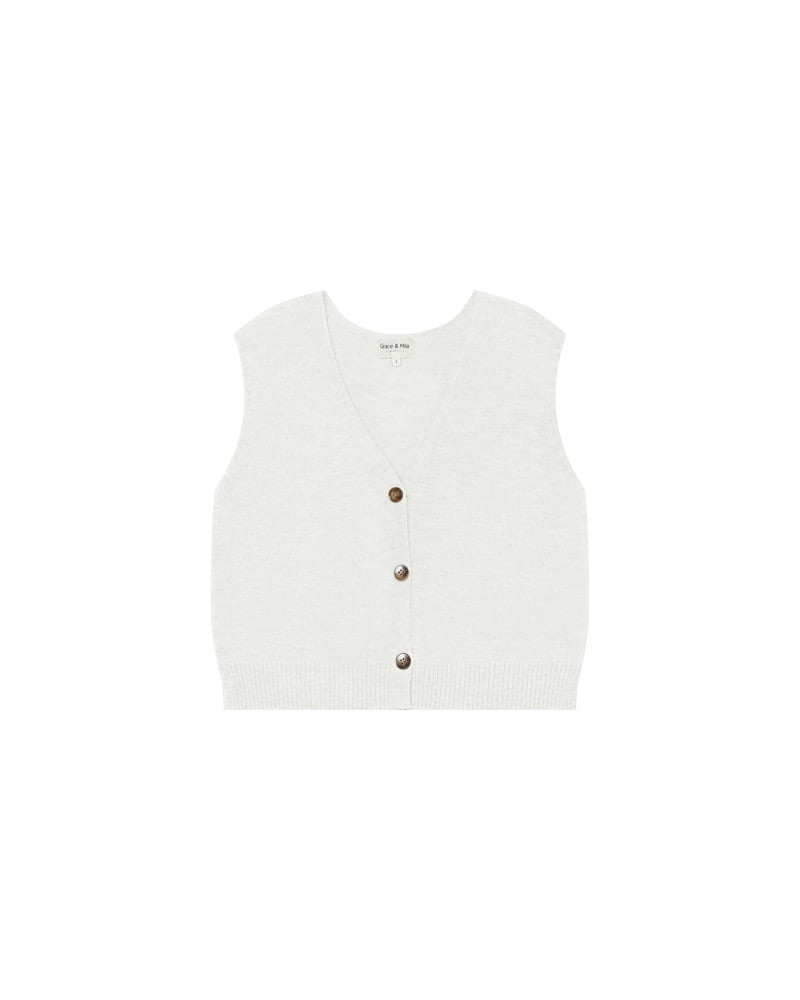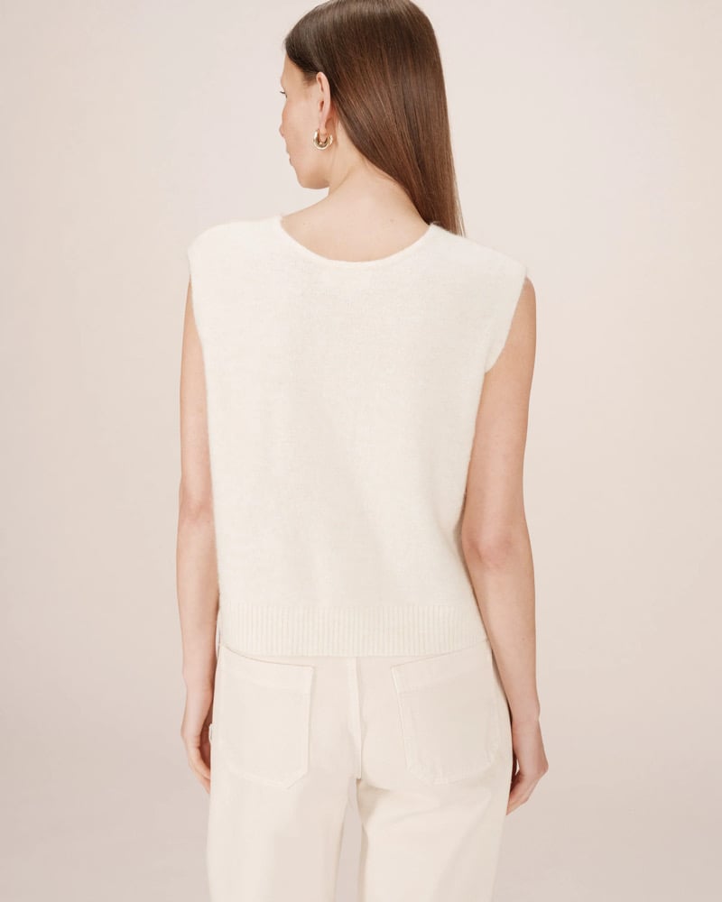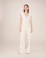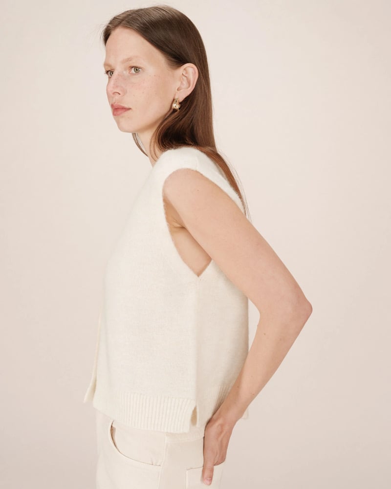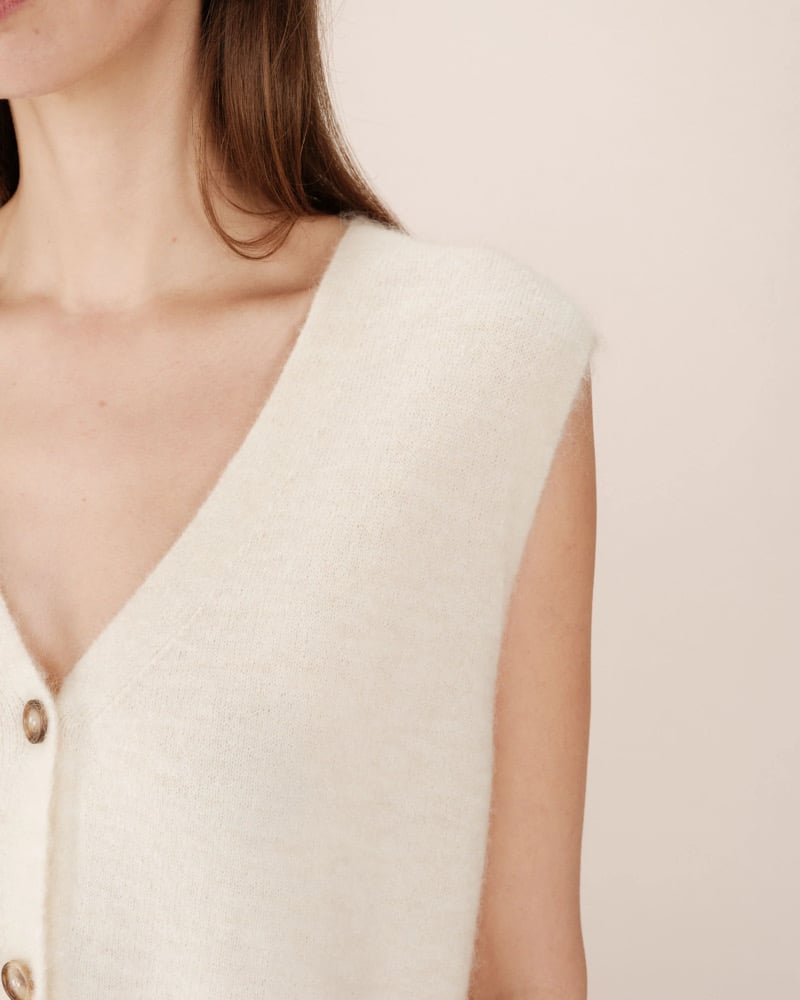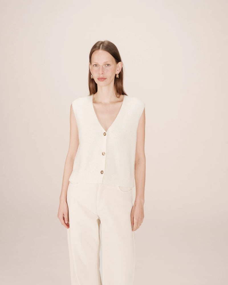 Completa el look: El cárdigan sin mangas SANTA se lleva con los vaqueros anchos JAMES para una silueta relajada y moderna.