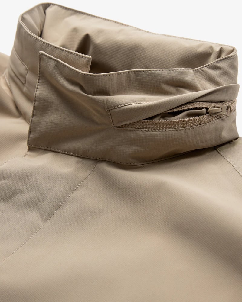 Es 100 % impermeable con costuras pegadas y una capucha empacable en el cuello.