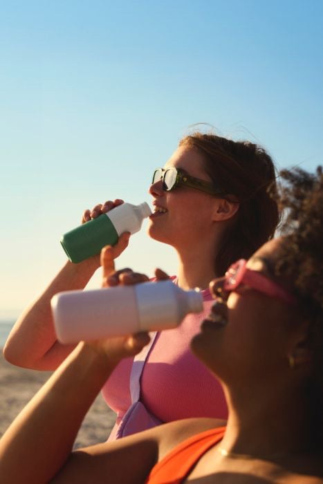 Diseño característico de tres partes: botella y vaso todo en uno para facilitar el llenado, la limpieza, el almacenamiento y compartir.