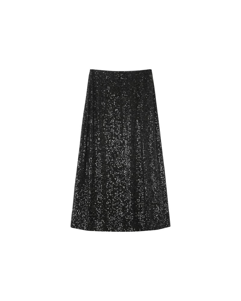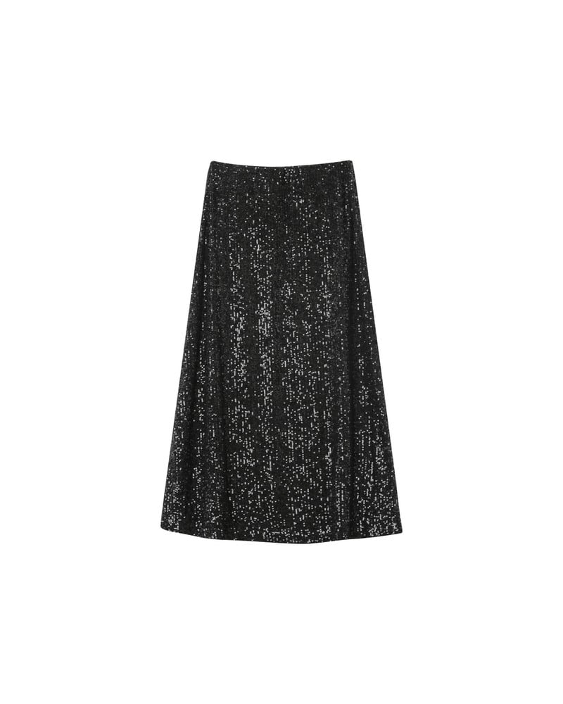 Confeccionada con un tejido decorado con lentejuelas, la falda larga OBSESSION es un imprescindible de la temporada.