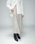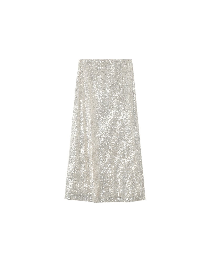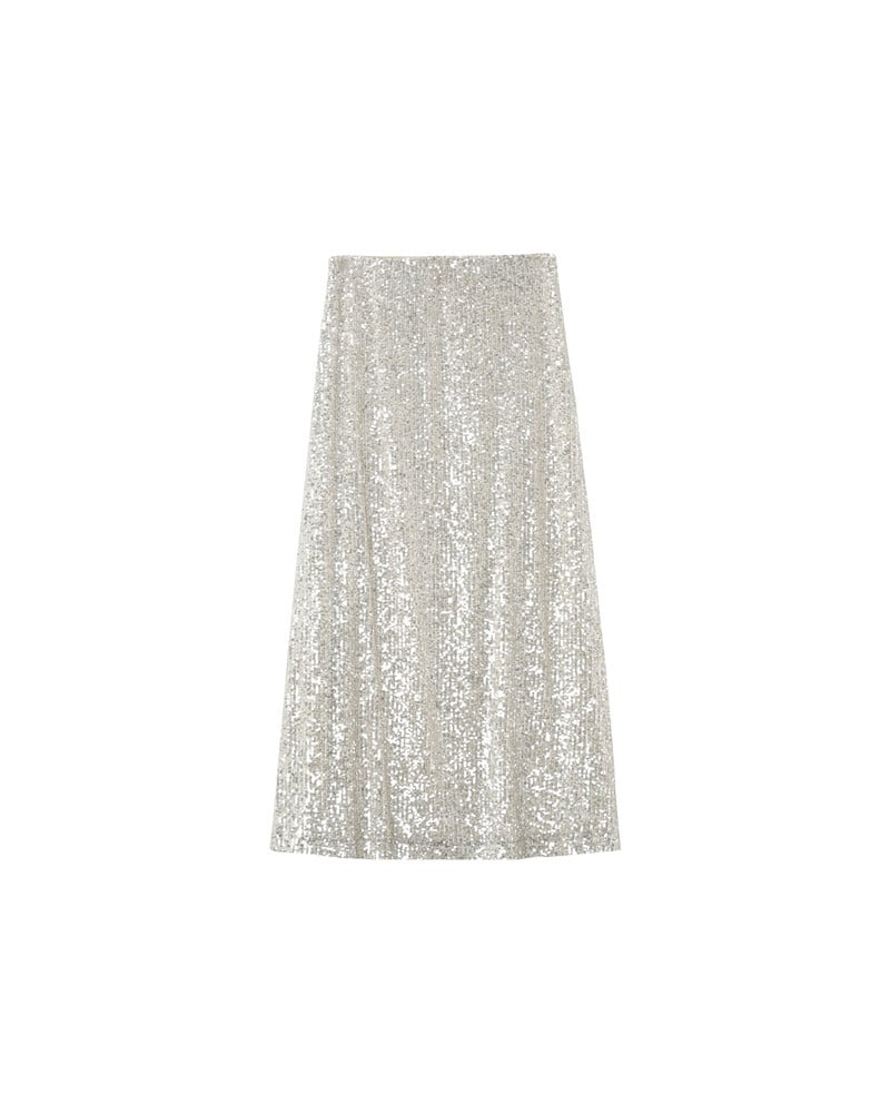 Confeccionada con un tejido decorado con lentejuelas, la falda larga OBSESSION es un imprescindible de la temporada.