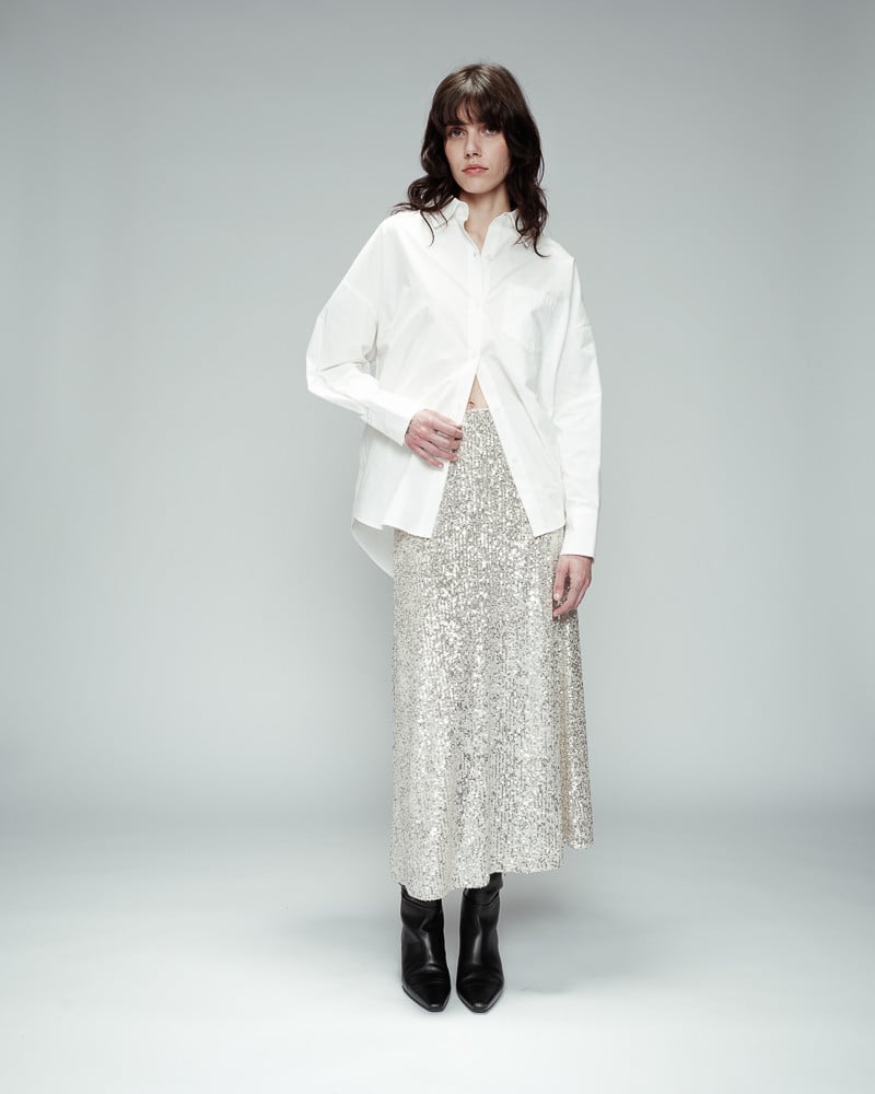 Completa el look: la falda de lentejuelas OBSESSION se lleva con el jersey de cuello alto liso o con la camisa oversize NESRINE, para un look moderno y moderno.