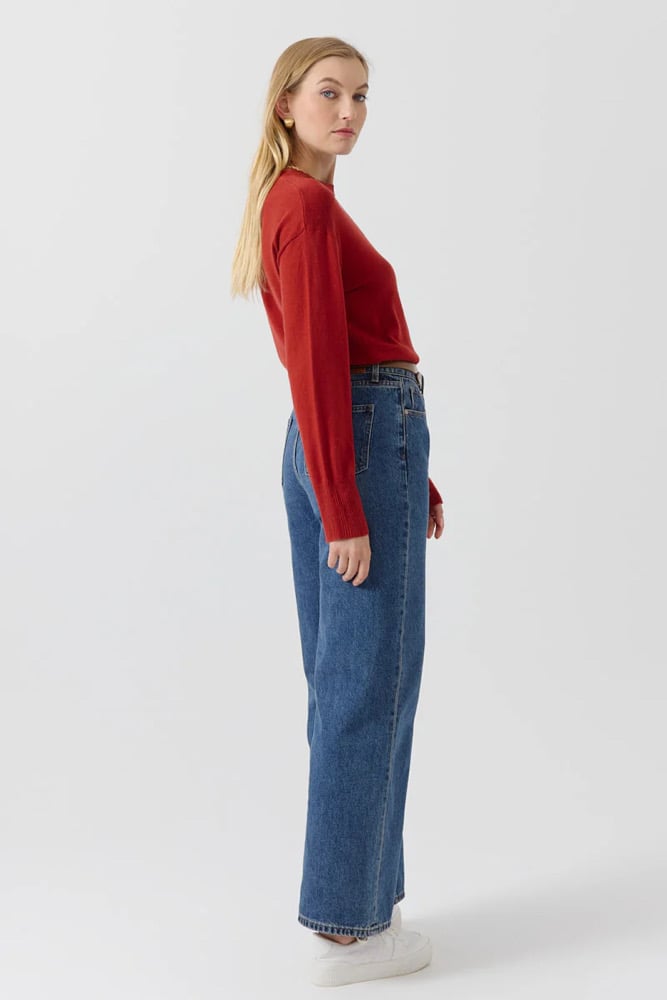 Suéter de cuello redondo en punto fino color topo, mangas largas y acabados acanalados.