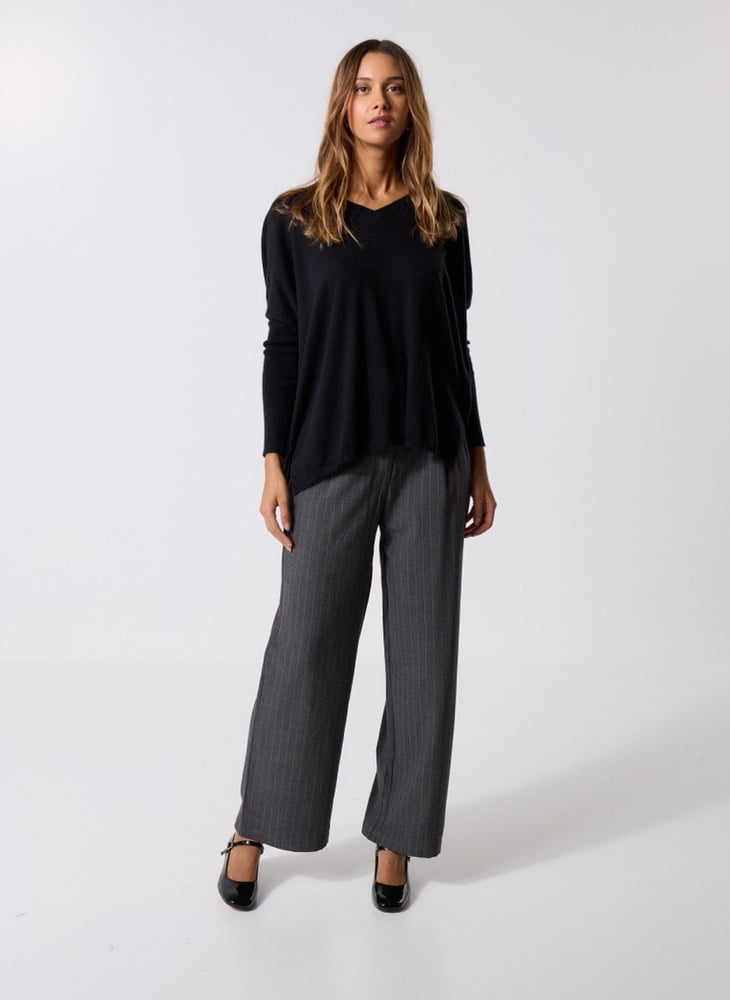 Jersey de murciélago de manga larga, cuello en V, bordes de canalé, corte holgado.