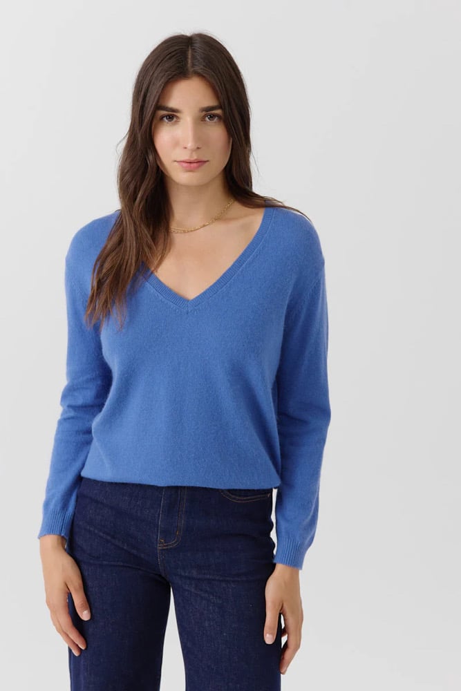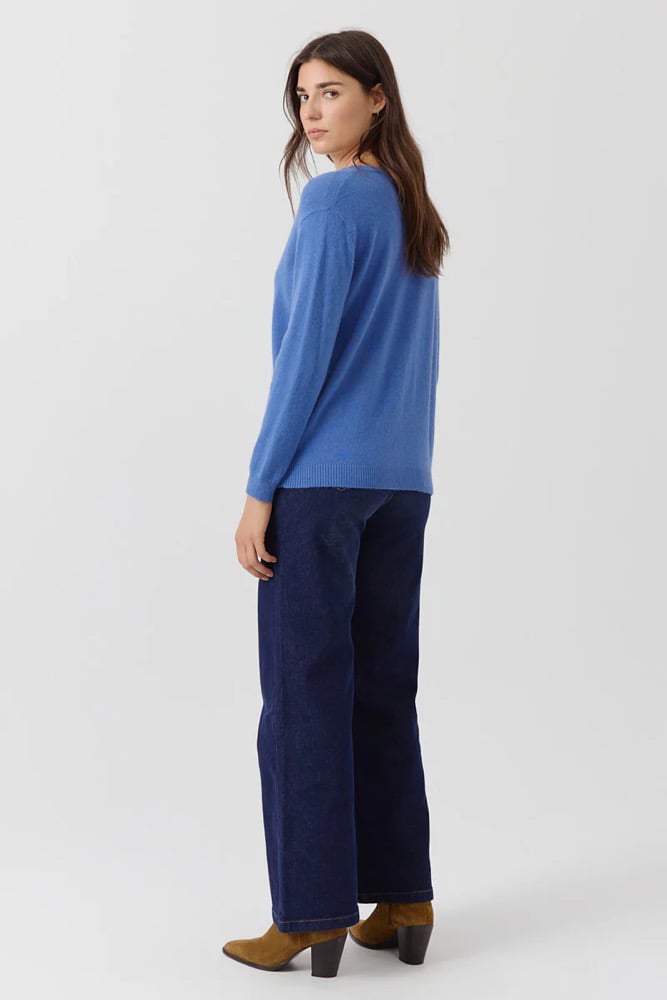 Jersey con cuello en V con diseño minimalista, detalles calados en la espalda.
