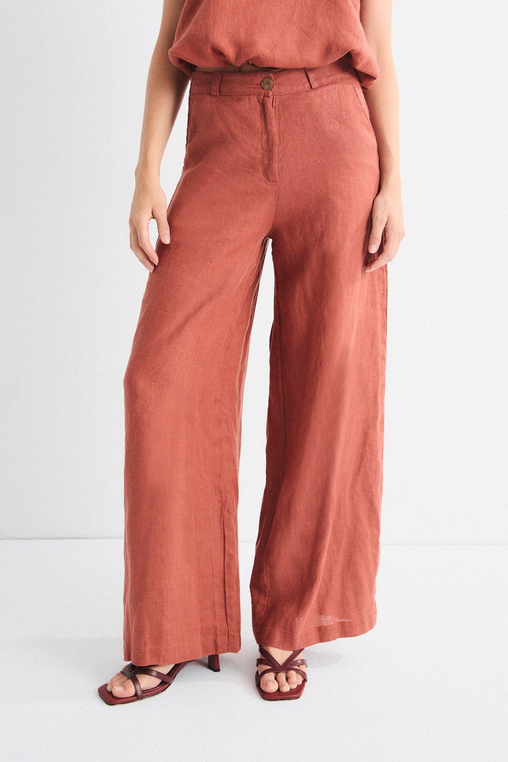 Pantalón de lino, con bragueta, cinturilla con trabillas y elástico en la espalda.