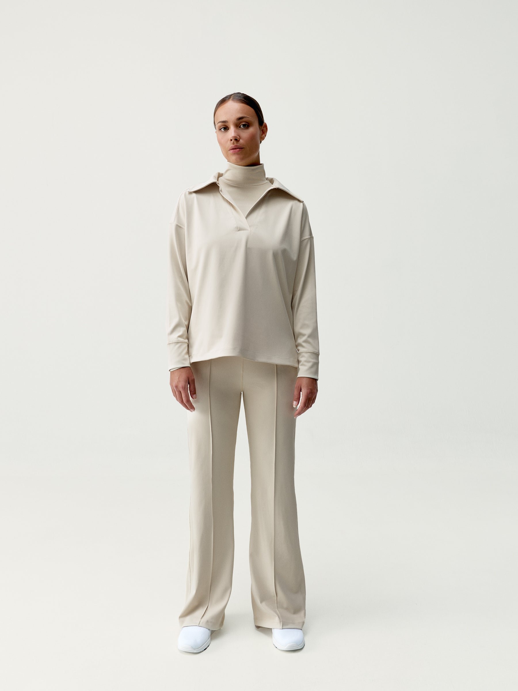 Pantalón largo tipo palazzo con bolsillos laterales.
