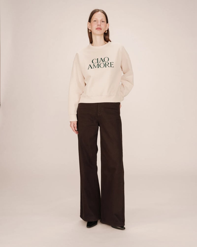- "Ciao Amore" estampado en terciopelo en la parte delantera