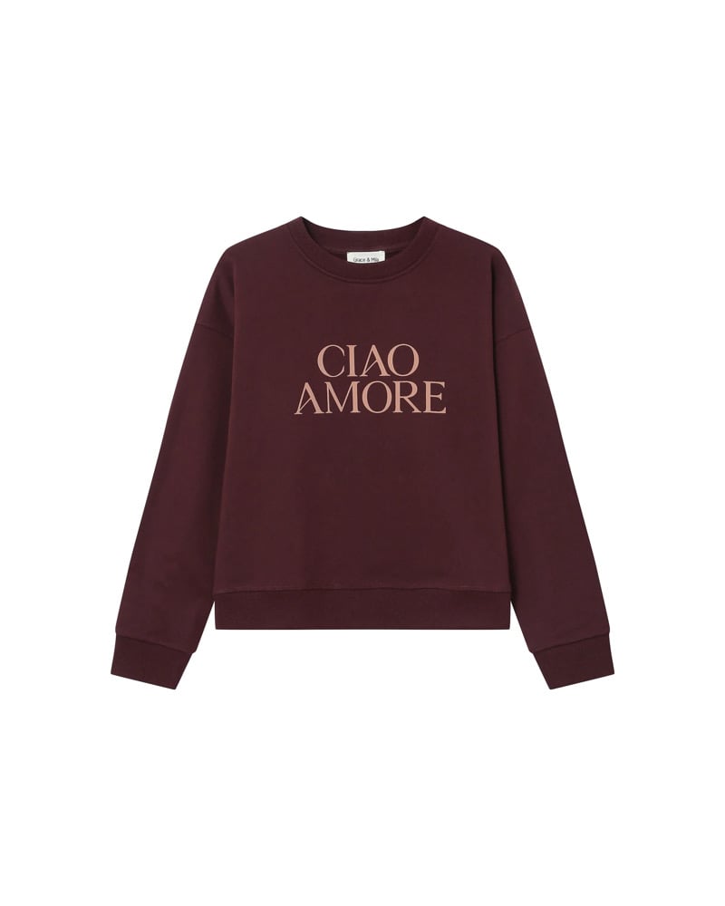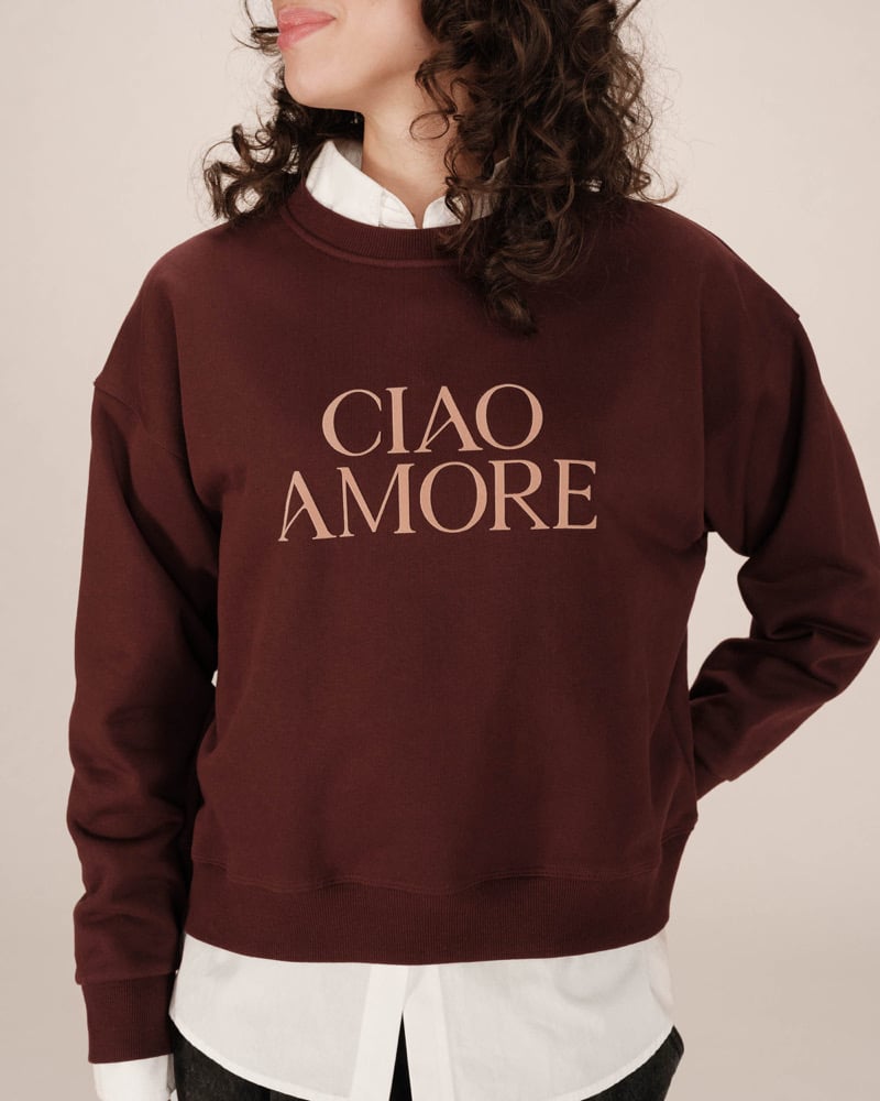 - "Ciao Amore" estampado en terciopelo en la parte delantera