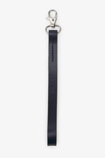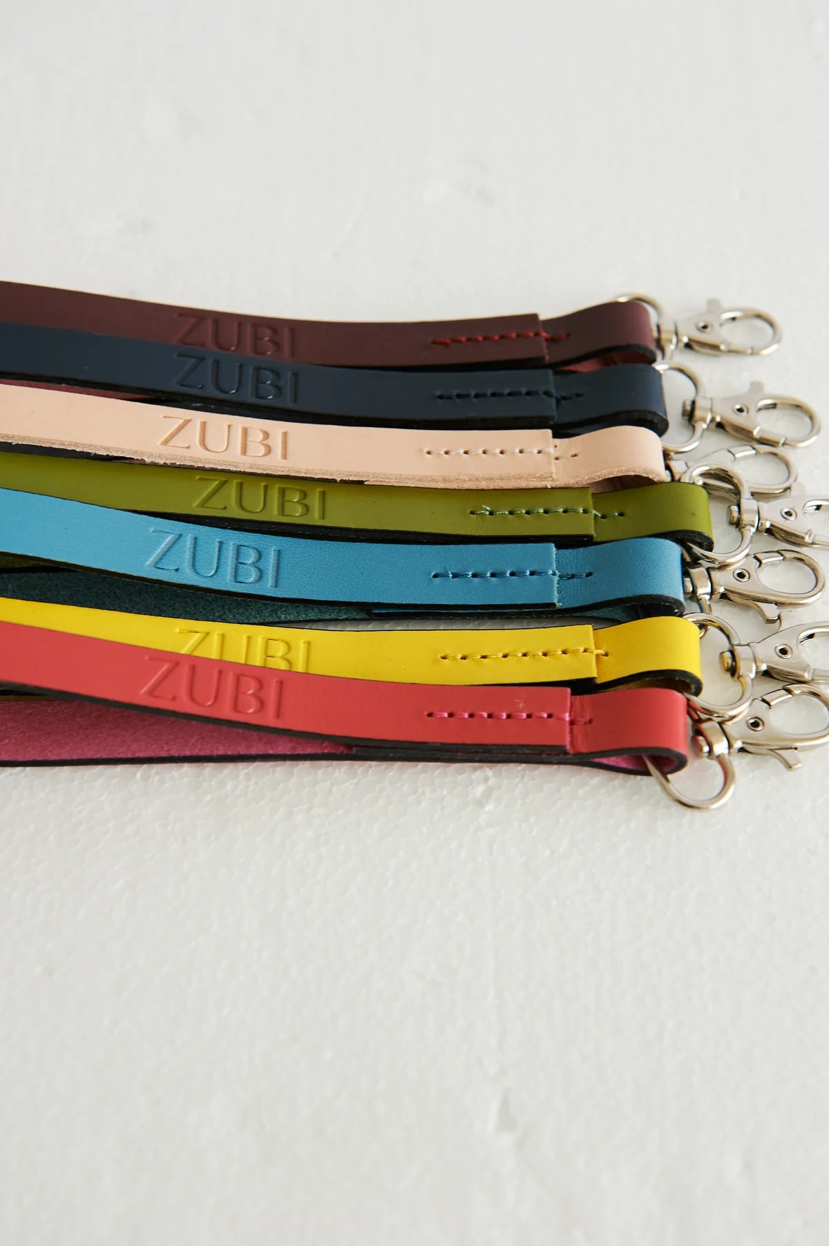 Tirador de piel con el logo de ZUBI, terminado con un mosquetón de aluminio.