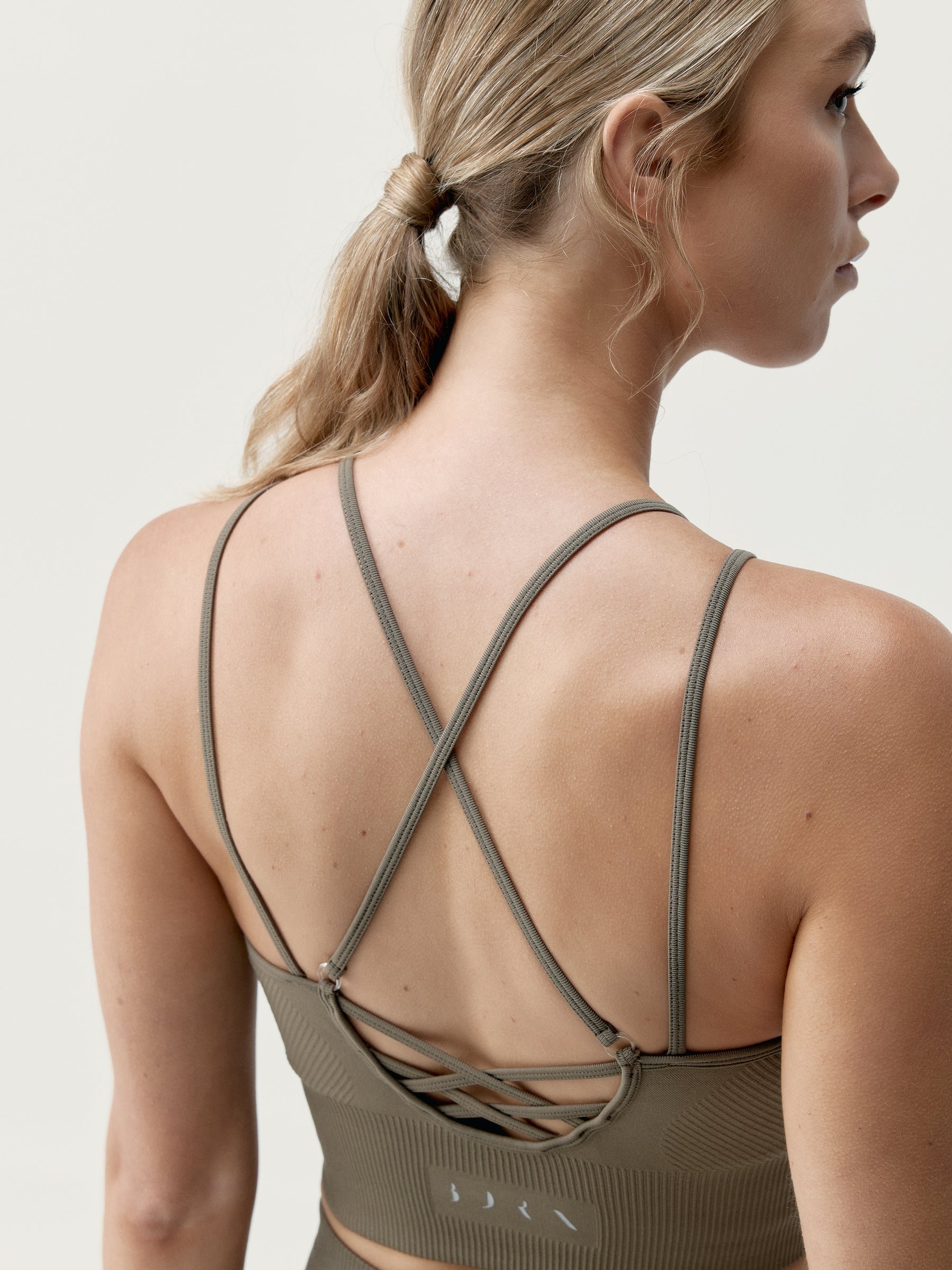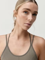 Detalle de calados y tirantes cruzados que aportan una máxima adaptabilidad y confort, permitiendo llegar a cualquier movimiento. Incluye copas extraíbles.