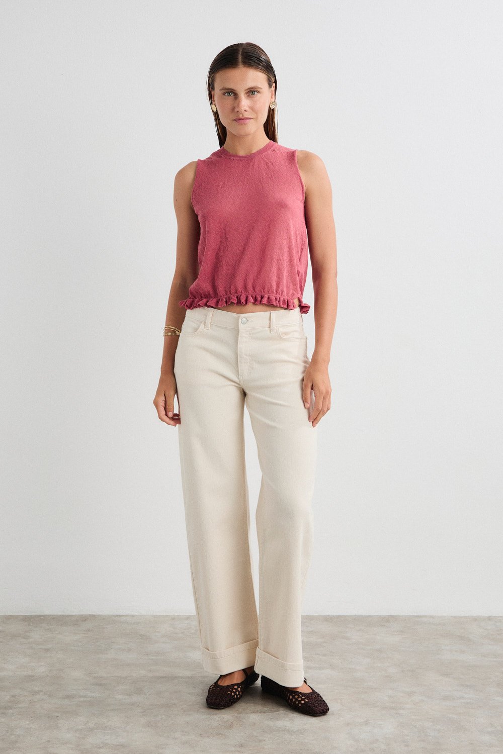 Top de tricot con mini volante en el bajo y cuello caja de canalé.