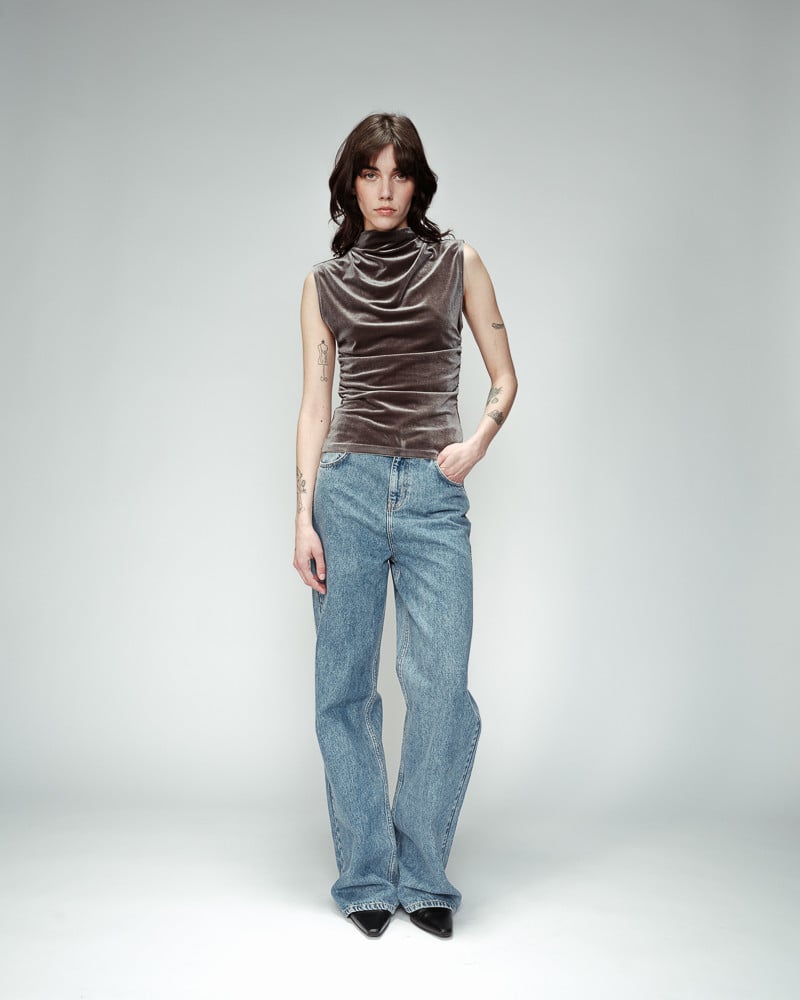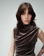 Confeccionado con un tejido de terciopelo, el top sin mangas ODESSA tiene un efecto drapeado en el busto que añade contraste y movimiento a la silueta.