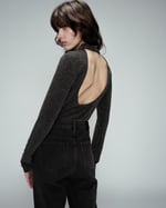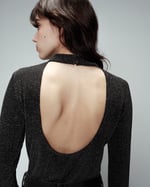 El top ORLANDO de lúrex está realzado por una abertura redonda en la espalda que deja ver la espalda con elegancia.