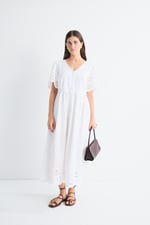 Vestido de manga corta abullonada con delicados bordados en el bajo y las bocamangas.