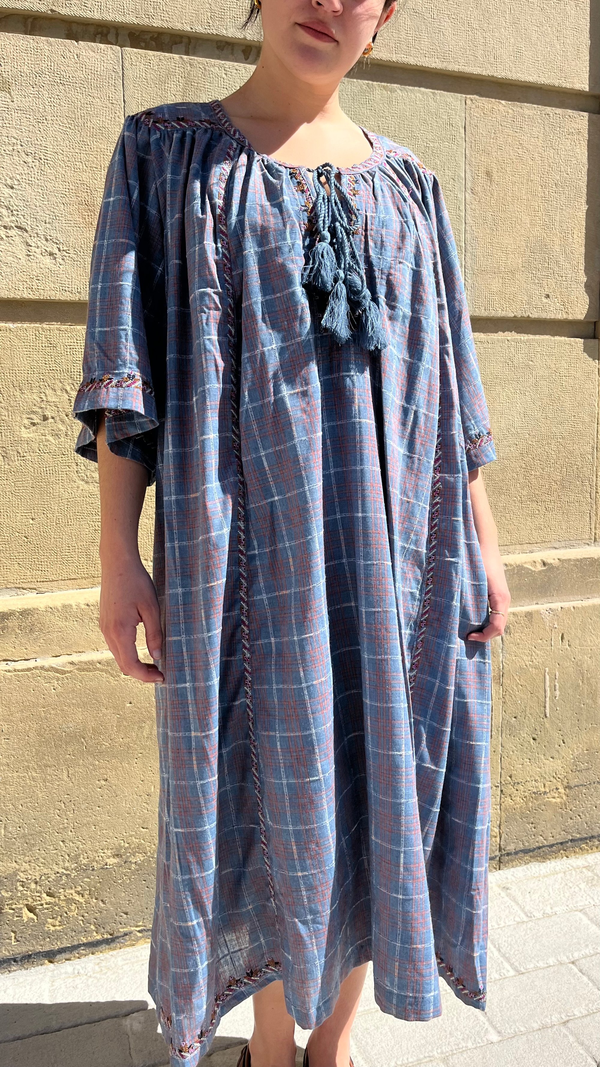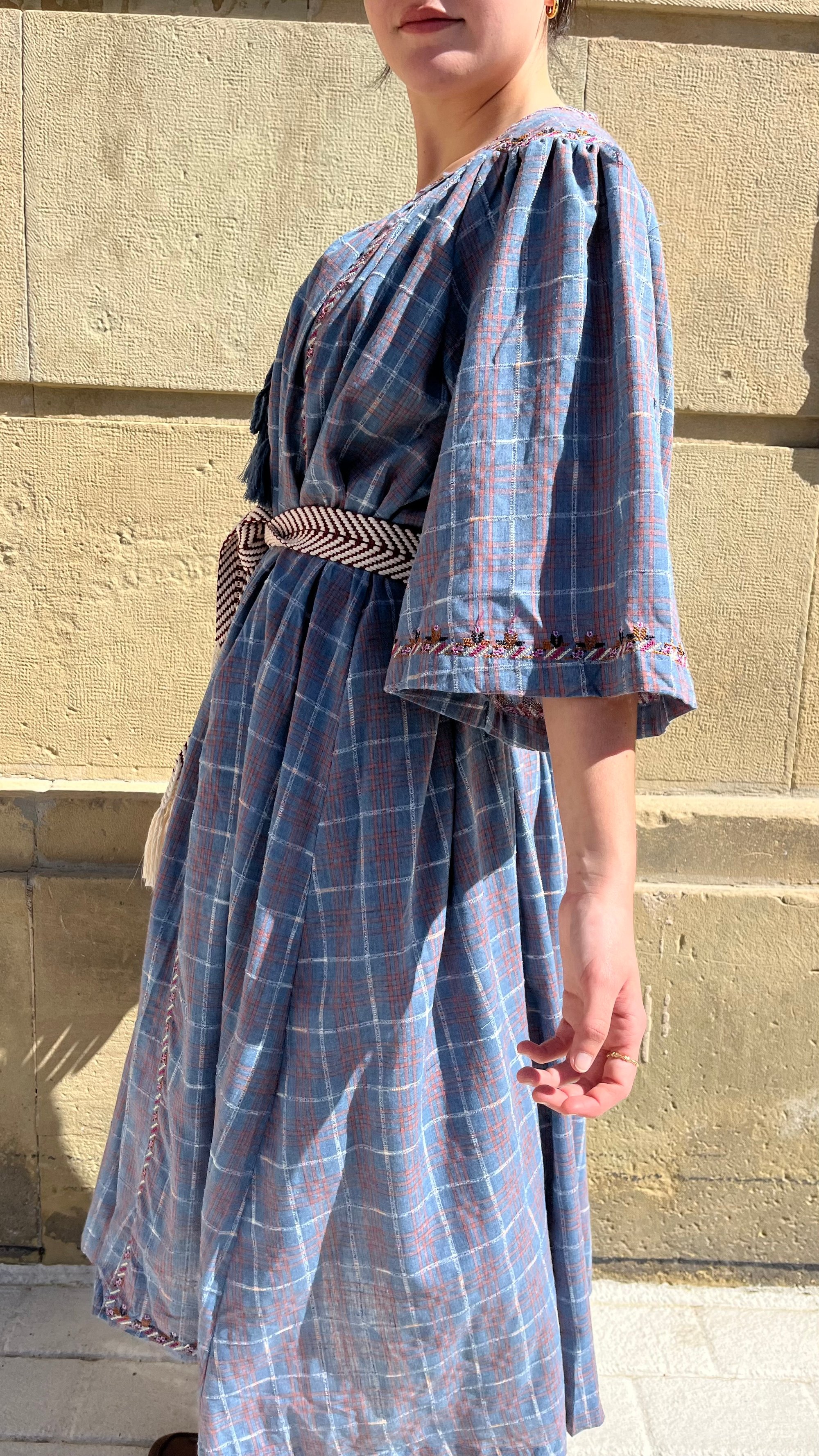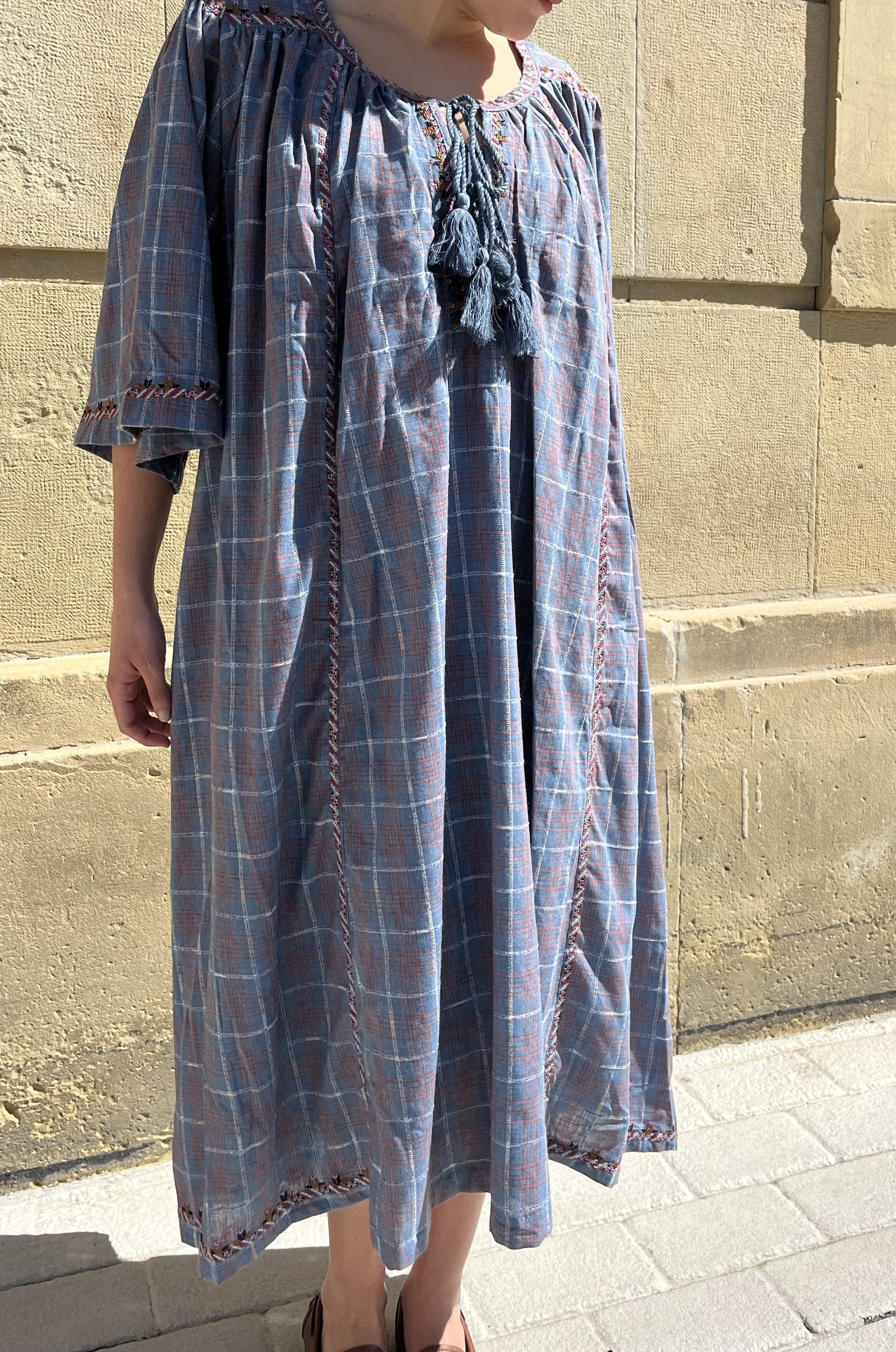 Vestido de estilo bohemio en tejido de cuadros azules , con delicados bordados decorativos en el escote, mangas y parte frontal.